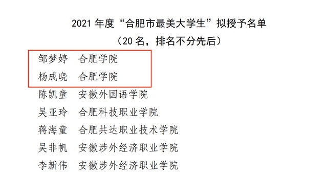 近日,由合肥市教育局、共青团合肥市委员会、合肥市学生联合会共同举办的寻访2021年度“合肥市最美学生”暨第九届“合肥市十佳学生”评选活动结果公布,我校学子郭兆薇、李庆锋荣获“合肥市十佳大学生”称号,邹梦婷、杨成晓荣获“合肥市最美大学生”称号。