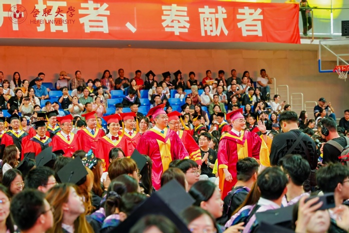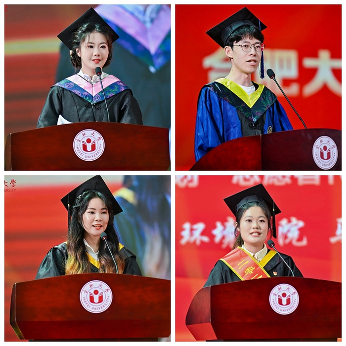 本科生毕业生代表朱茜茹、研究生毕业生代表李小凡、留学生毕业生代表苏珍秋、“西部计划”毕业生志愿者代表马慧子、教师代表肖赟教授相继发言。朱茜如表示将以校训“厚德、博学、善思、致用”为精神动力,不负伟大时代,交上一份无愧于“合大人”的青春答卷。李小凡表示,将作为基层选调生积极把技术融入乡村治理,把论文写在祖国大地上。苏珍秋感恩合大培养及“一带一路”倡议带来的机遇,立志成为中柬文化交流桥梁。马慧子承诺扎根新疆基层,以“功成必定有我”的担当投身西部建设。肖赟赠言毕业生“保持自信、学习、温情”,以中科院院士逆境成长为例,勉励做有温度的时代青年。