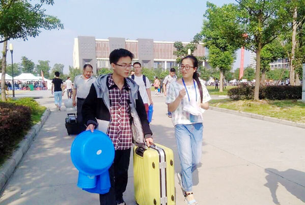 化学与材料工程系的2015级新生行少冬,为了把握机会锻炼自己,只身一人,拖着行李箱、背着背包,坐上开往合肥的火车。历经15个小时,在9号清晨顺利到达合肥火车站。他告诉记者,一来到学校,就被美丽的风景所吸引,热心的志愿者亲自帮他排队领代购物品,并耐心介绍学校情况,一直帮他送到宿舍,完成报到,让他倍感亲切。