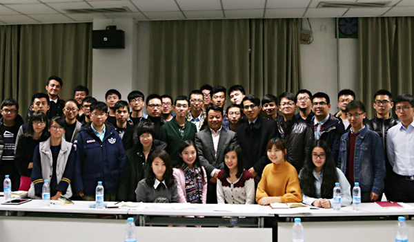 团中央书记处傅振邦书记与潘吉庆同学所在班级交流并合影留恋