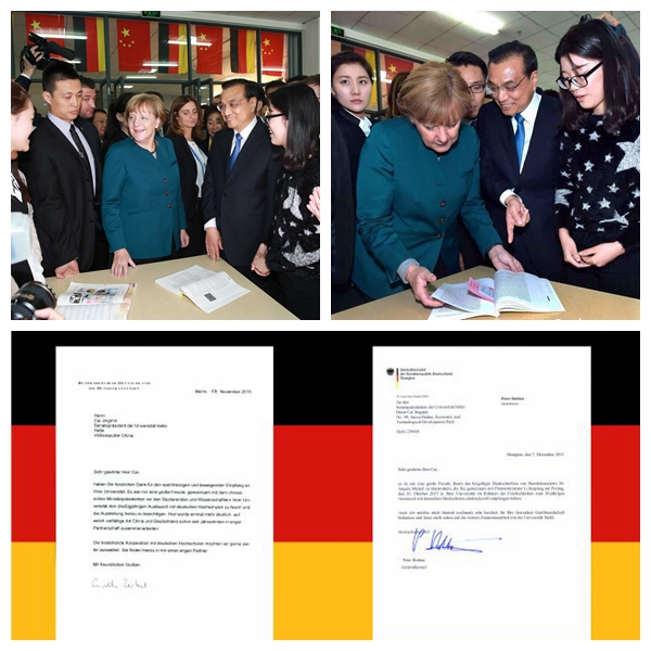 2015年10月30日,李克强总理陪同默克尔总理视察了合肥学院,两国总理对合肥学院三十年对德合作交流所取得的成果给予了高度评价,共同决定在合肥学院建立“中德教育合作示范基地”。两国总理在校期间共同参观了“中德合作共建合肥学院三十周年展”,品尝了中德学生合作酿制的“德国黑啤”并与我校青年学子进行亲切的交谈。在国务院总理李克强与德国总理默克尔的见证下,中国孔子学院总部、德国施特拉尔松德应用科学大学与合肥学院合作设立德国施特拉尔松德应用科学大学孔子学院。2015年12月7日,德国总理安格拉·默克尔给学校发来感谢信,表示:合肥学院与德国高校三十年的合作交流“又一次有力地表明了,几十年来中国和德国以多姿多彩的方式进行了密切的伙伴合作”。“我们很愿意进一步扩大贵校与德国高校间现有的合作,在此方面,我乐意成为你们的密切合作伙伴”。(宣传部)