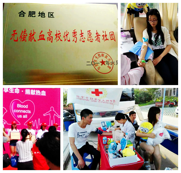 6月14日是第13个世界献血者日,是世界卫生组织为今年的“6·14世界献血者日”确定主题为“血液连接你我”。我校红十字会同学们参与了全省2016年献血者日庆祝活动,我校大学生红十字会荣获合肥市“无偿献血高校优秀志愿者社团”称号。