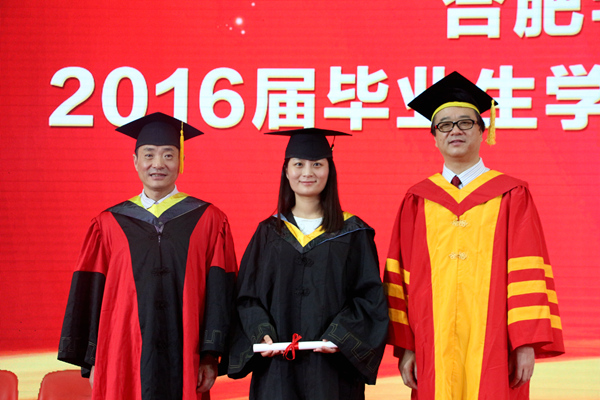 各系毕业生身着学士服依次上台,从系学位委员会主任手中领过印有“合肥学院”字样的学位证书,校领导们亲手为毕业生拨正流苏,并合影留念。