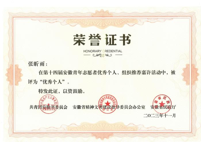 近日,由团省委、省文明办、省民政厅联合开展的第十四届安徽省青年志愿者“优秀组织”“优秀个人名单公布,我校青年志愿者联合会获评“安徽省青年志愿者优秀组织”,经济与管理学院张昕雨同学获评“安徽省青年志愿者优秀个人”。