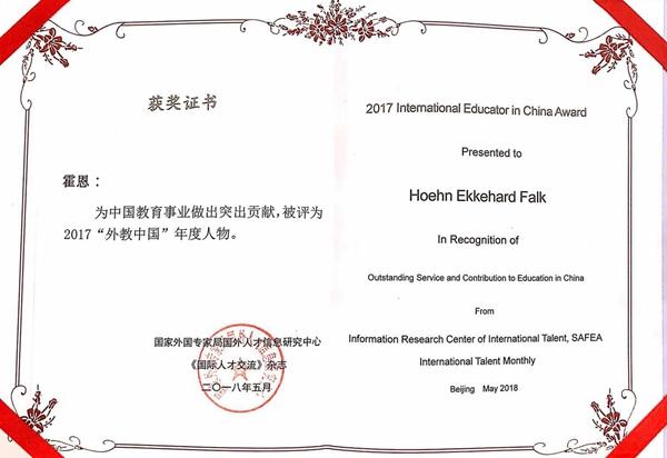 Es war besonders erwähnenswert, dass der Preis „2017 ausländische Lehrer in China“ einer Gruppe von hervorragenden ausländischen kulturellen und pädagogischen Experten verliehen wurde. Herr Professor Höhn, stellvertretender Präsident unserer Universität, erhielt auch diese Auszeichnung. Im Namen ihres Vaters kam Frau Theresa Höhn zur Tsinghua-Universität und nahm die Auszeichnung entgegen.